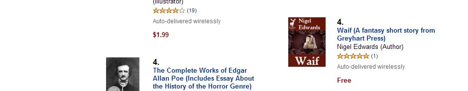 Well, okay, it’s stretching things to say Nigel is a bestseller because Amazon have decided to make his story Waif free from amazon.com Don’t ask me why. This has only happened in the past few days but for some reason readers are choosing Nigel’s story because when I looked just now it was at #4 in the short story chart and in the top#200 all Kindle books.