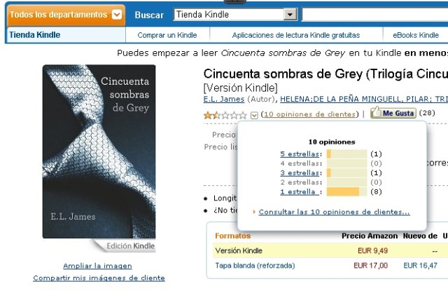 Looking further afield than our own books, I find 50 Shades of Grey interesting. If you don’t know it, this is a book that’s come from nowhere to be wildly successful — especially as a Kindle book — on both sides of the Atlantic. If you haven’t come across it, it’s often referred to in the press as ‘mummy porn’ — and, no, I suggest you don’t put that term into Google to see what that means. Across continental Europe, it’s been translated into German, Spanish, Italian, and French, and sold in the native Kindle Stores. It’s a big yawn with no reaction from anywhere except for Spain, where for some reason it’s the bestselling Kindle book of all. Perhaps it’s an antidote to the rioting and bank crises? If so, then it’s not exactly getting a ringing endorsement from readers; just look at the reviews on Amazon…