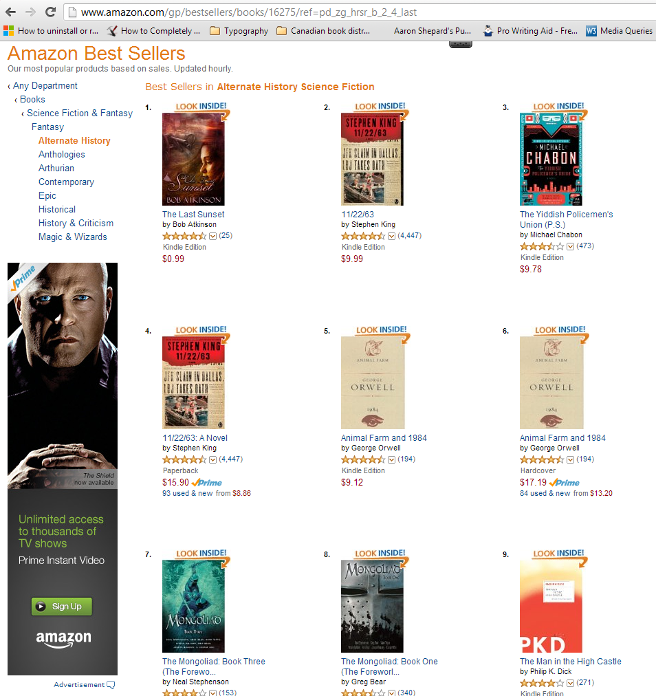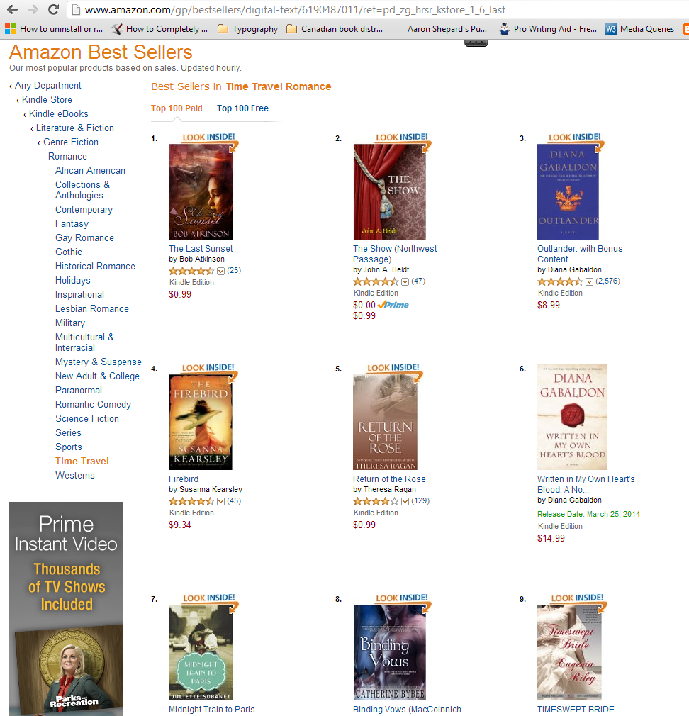 Many well-deserved congratulations to Bob Atkinson whose alternate history/ time travel romance novel The Last Sunset is currently at the top of TWO bestseller charts on amazon.com : alternate history (books) and time travel romance (Kindle).