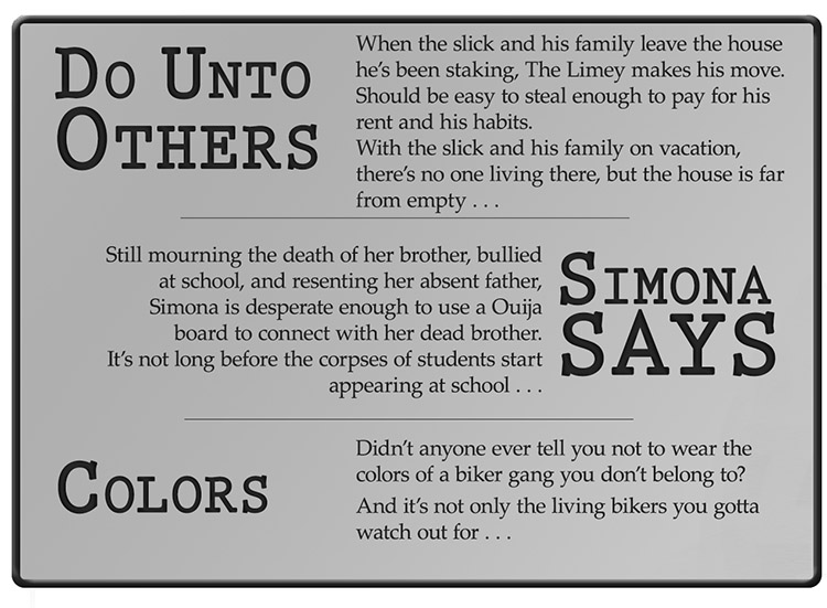 DO UNTO OTHERS (short story) – Jeremy is a street hood, lawless and unchained. When he is wronged by a local businessman, it becomes his mission to seek revenge. But his new enemy has friends – ones that don’t take kindly to intruders.