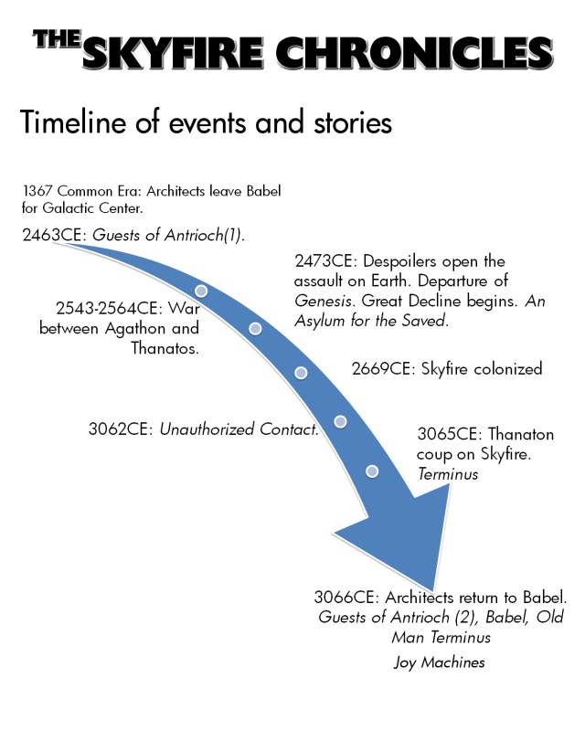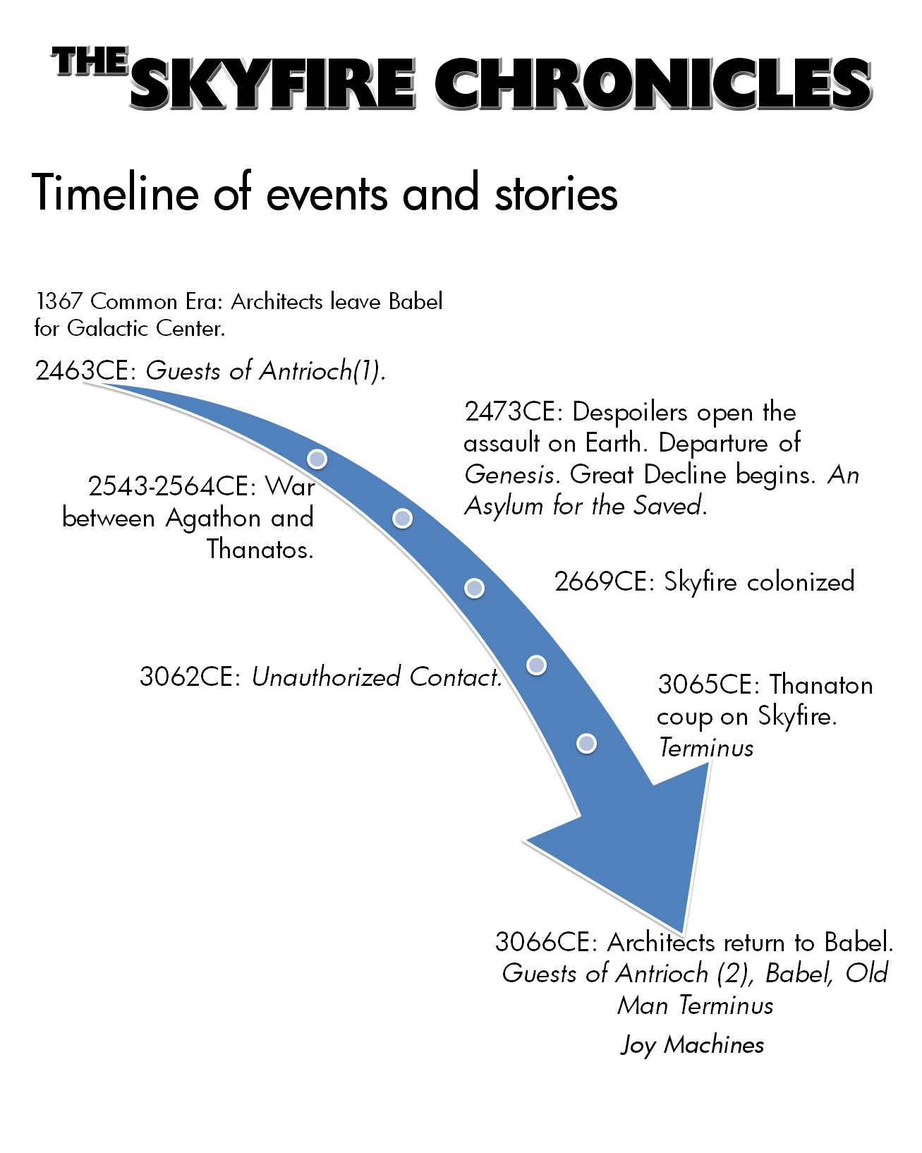 11 Sept 12  – We’ve added a Skyfire Chronicles timeline (on this page, above) in advance of the new Skyfire collection out later this month called Unauthorized Contact